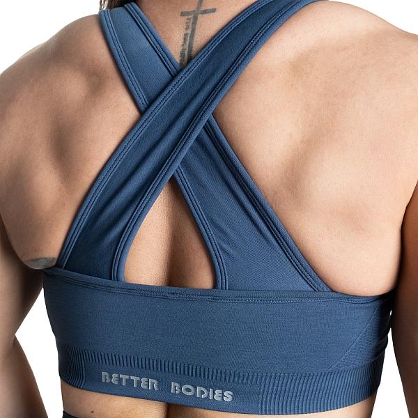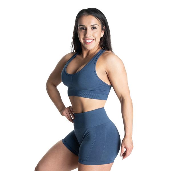 Features: Seamless, soft hand feel, rib at hem, scrunch at front, wide shoulder straps for comfort, removable pads